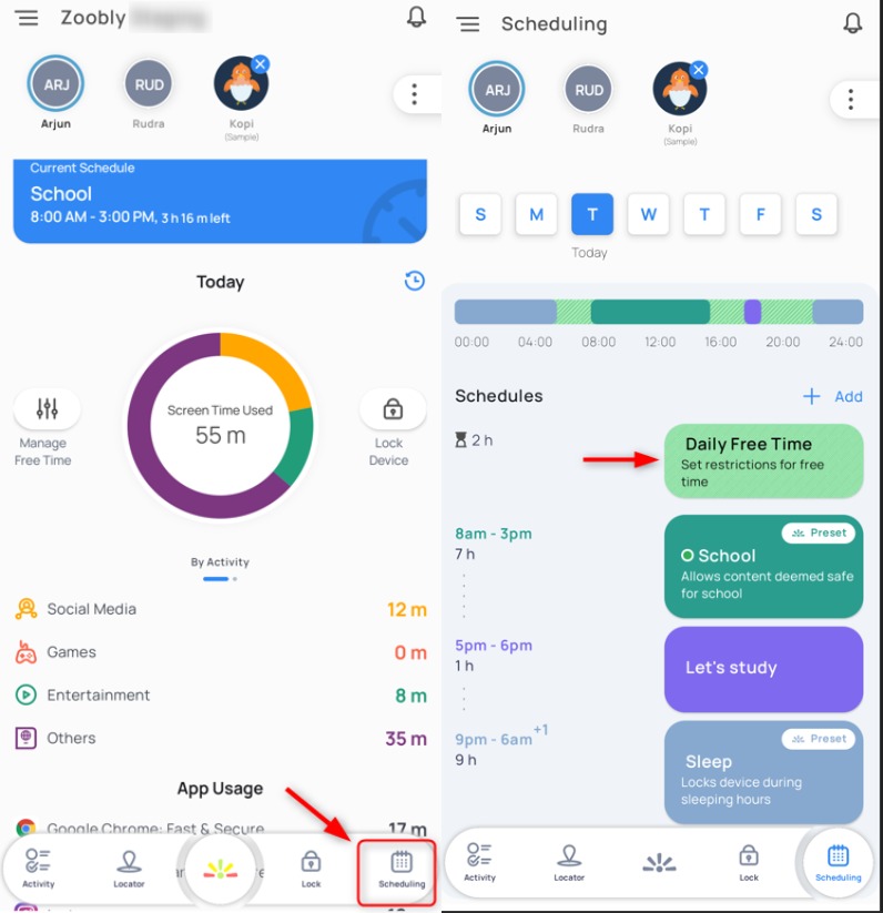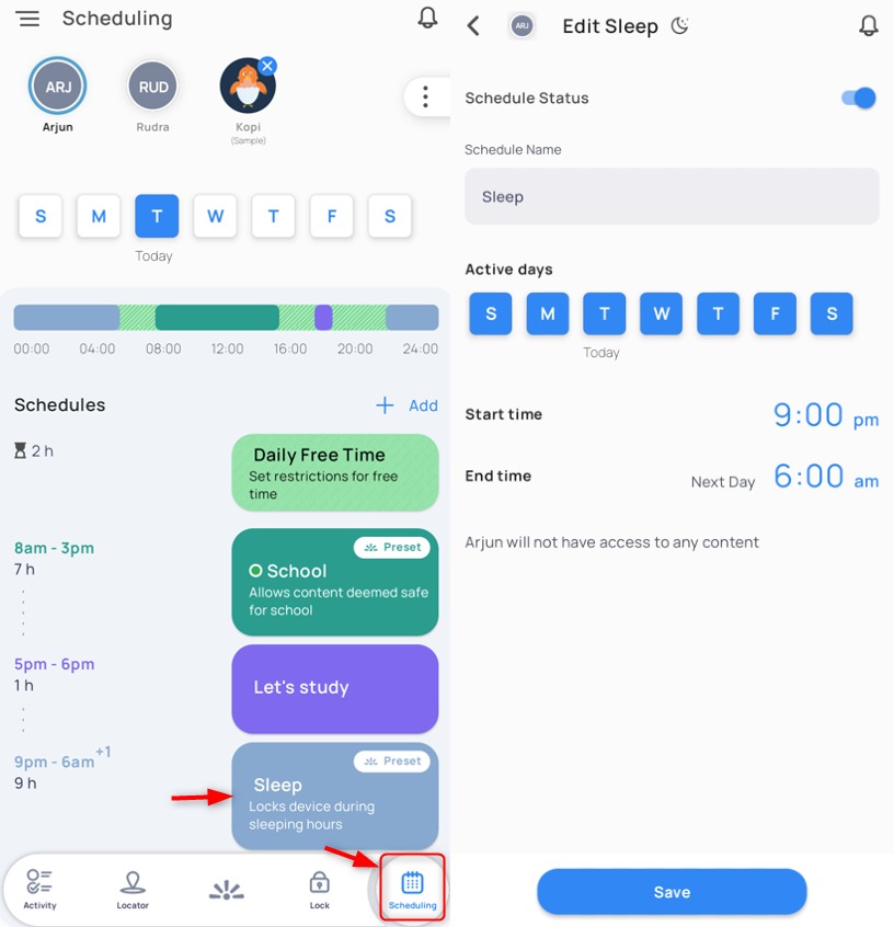 Sleep Schedule: Set up a Sleep Schedule for healthy routines. Pause access to their devices at bedtime to support better sleep.