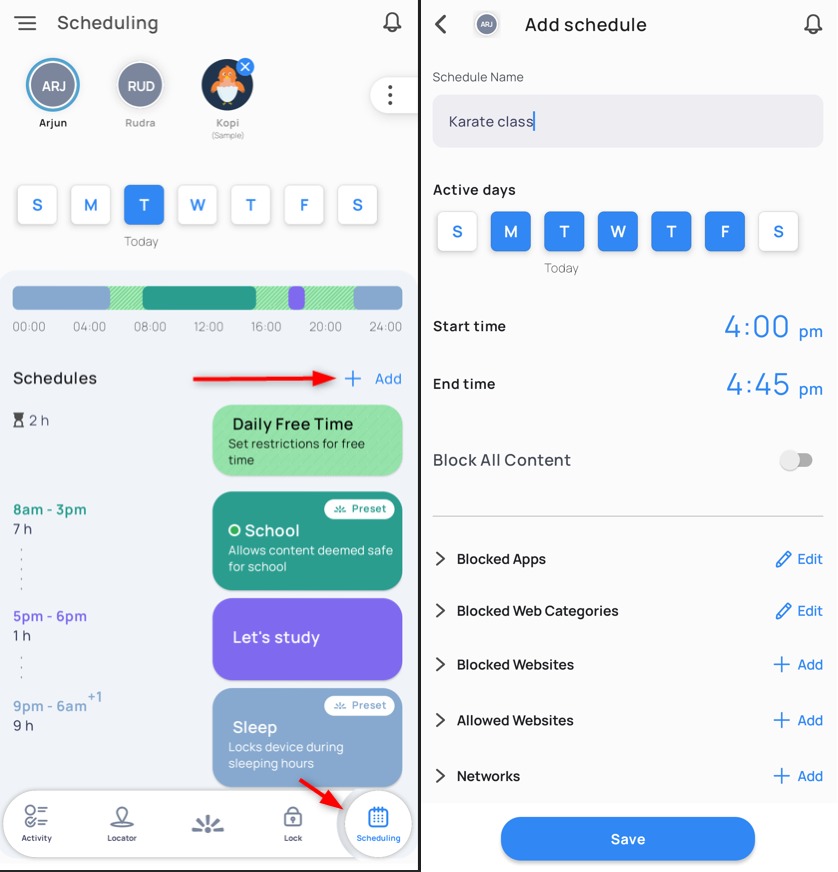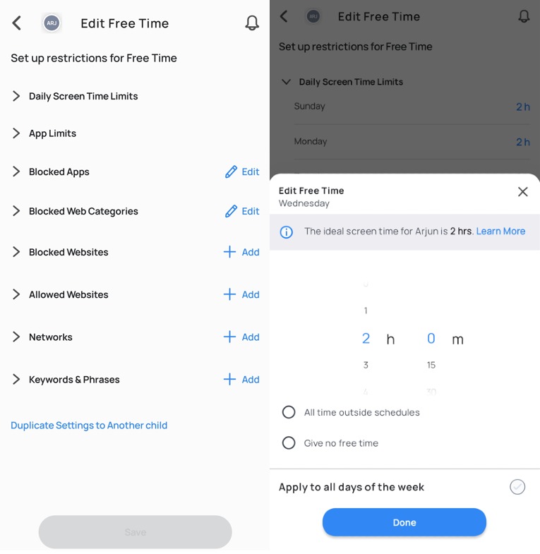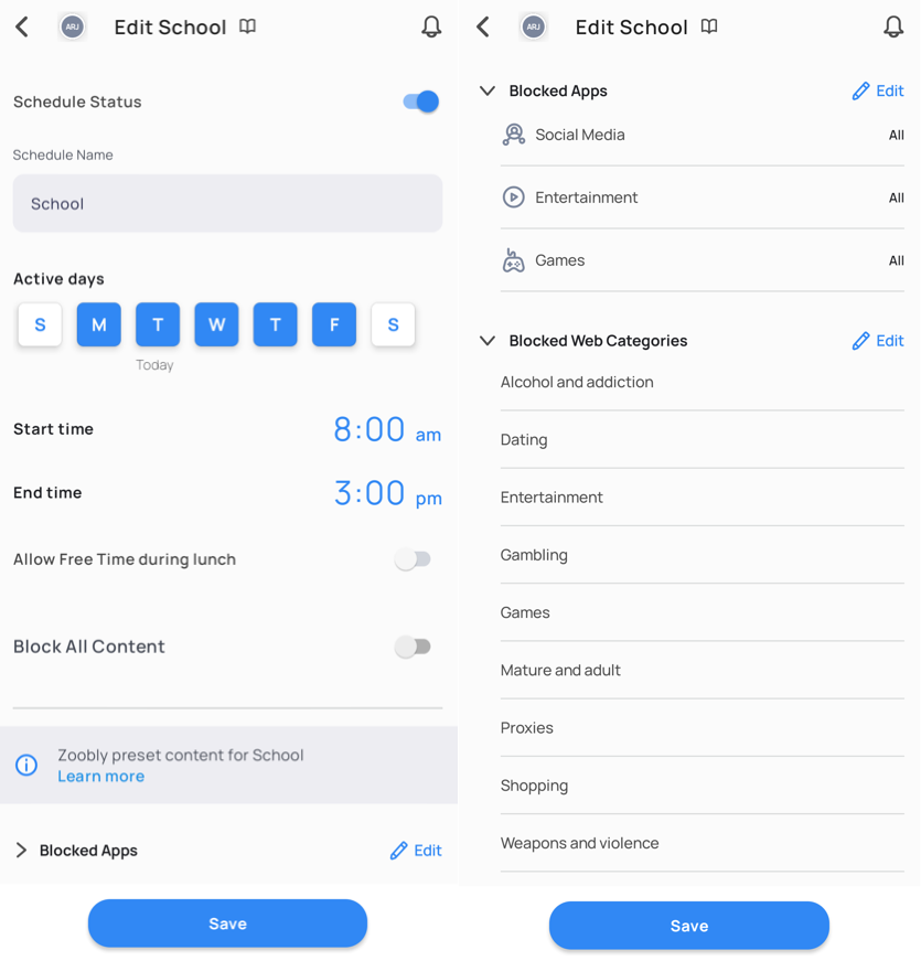 School Schedule: Block distracting content during school hours to help your child stay focused. You can allow Free Time during lunch or block everything completely if needed.
