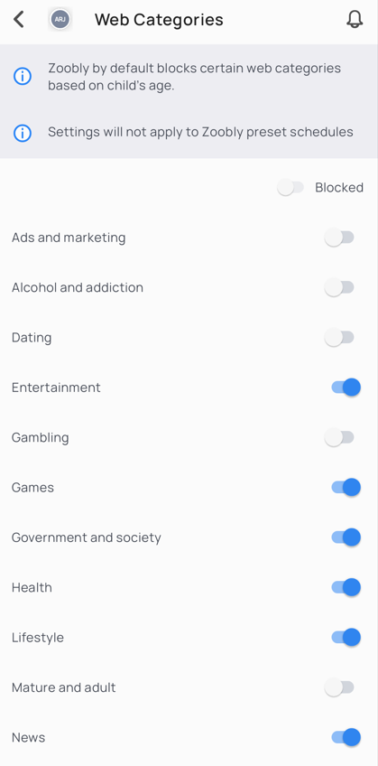 Tap the toggle next to each web category to allow (blue) or block (grey) it. Zoobly by default blocks access to adult, mature, and unsafe categories — such as weapons, violence, proxies and hacking.