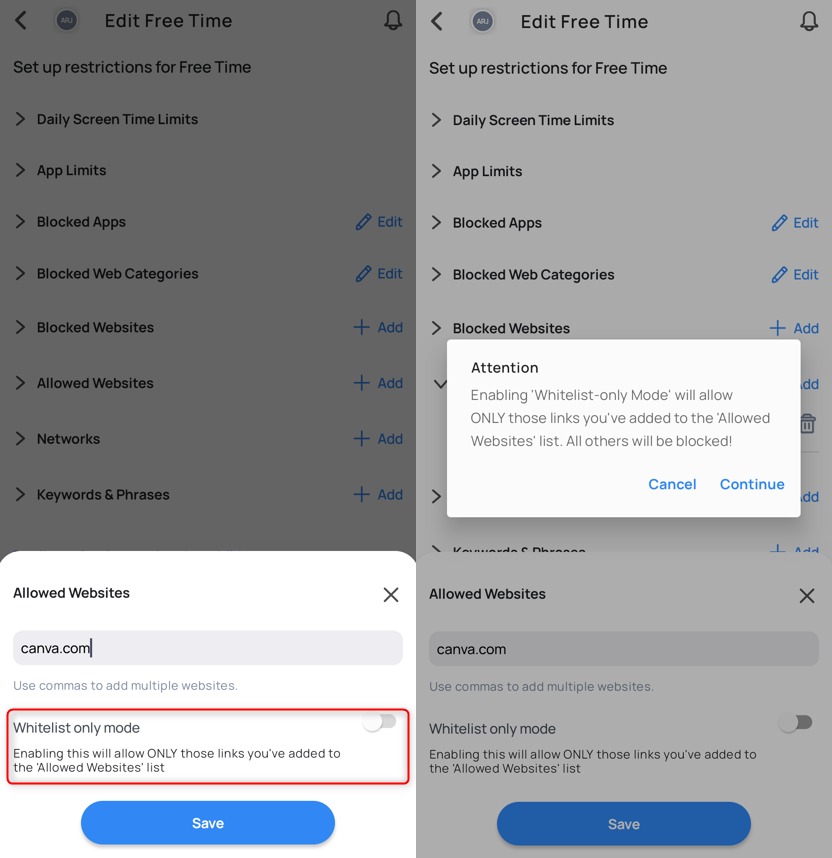 To allow your child visit only selected websites, turn on Whitelist-only mode under Allowed websites. This will let them access only the sites on the Allowed list while all others remain blocked.