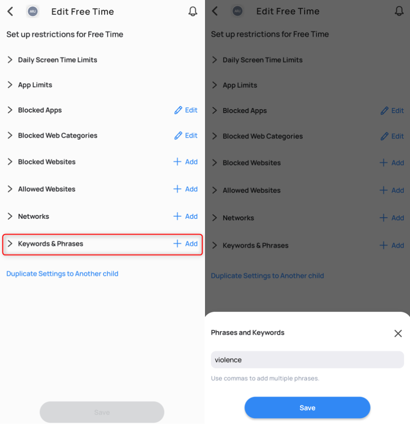 If there are specific words or phrases you don’t want your child to search for, you can add them to the Keywords & Phrases list.