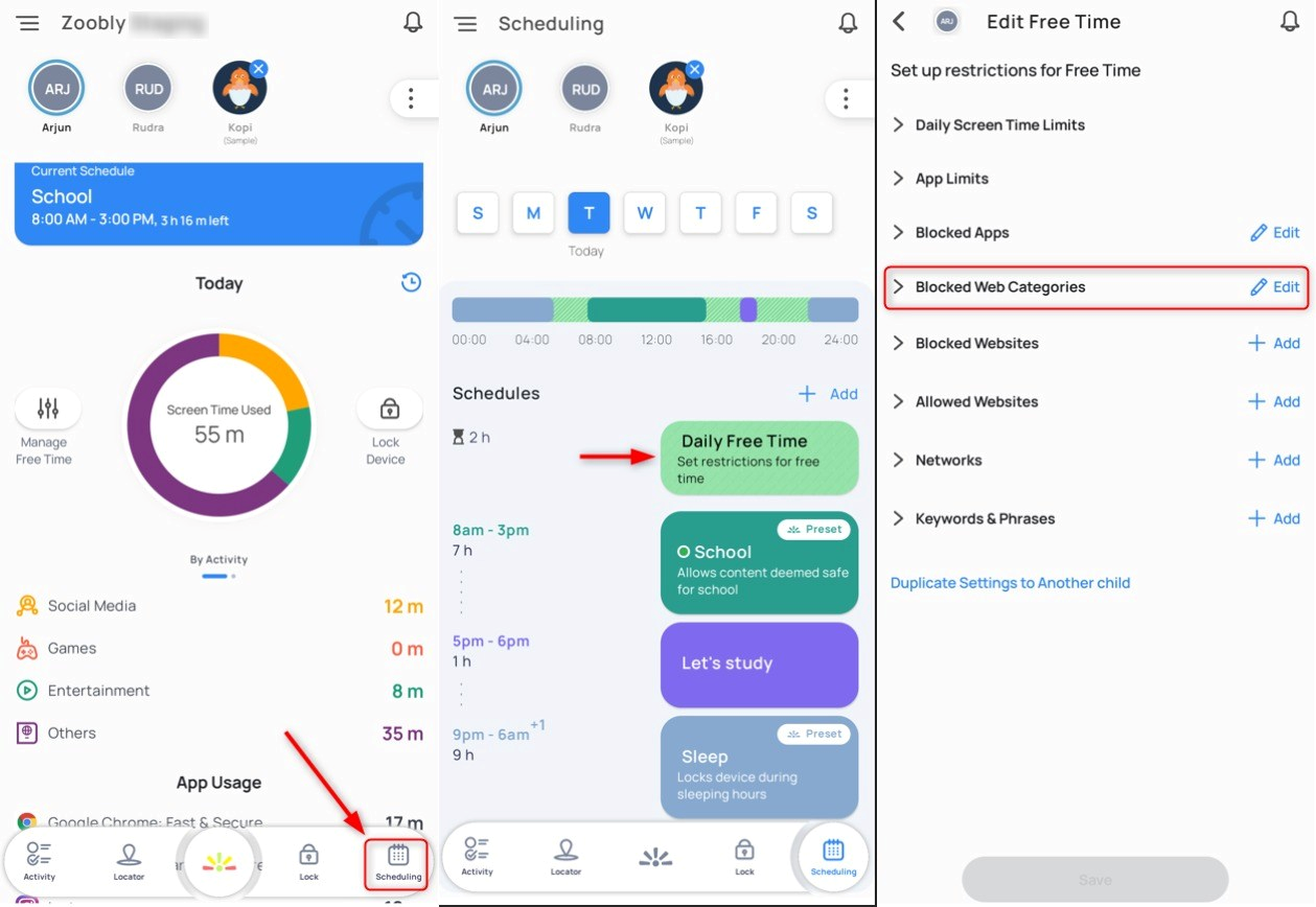 Go to Scheduling > Select your child > Daily Free Time > Blocked Web Categories > Edit.