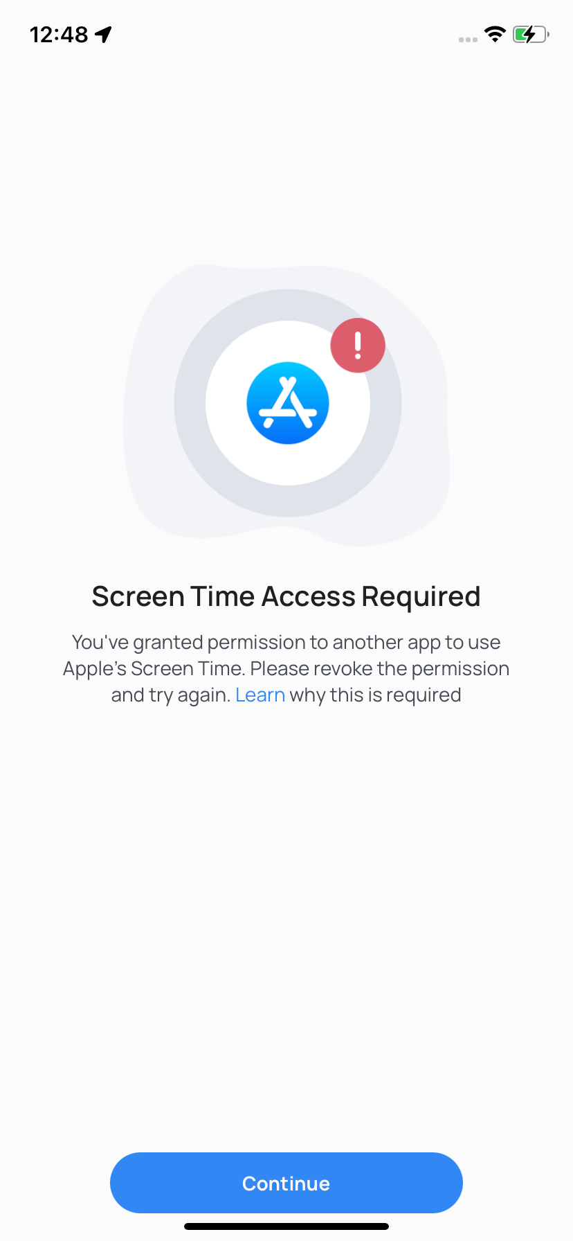 Apple allows only one third-party app to use Screen Time permissions at a time. If you see the below error while setting up zoobly, it likely means another app was previously granted permission to access Screen Time.